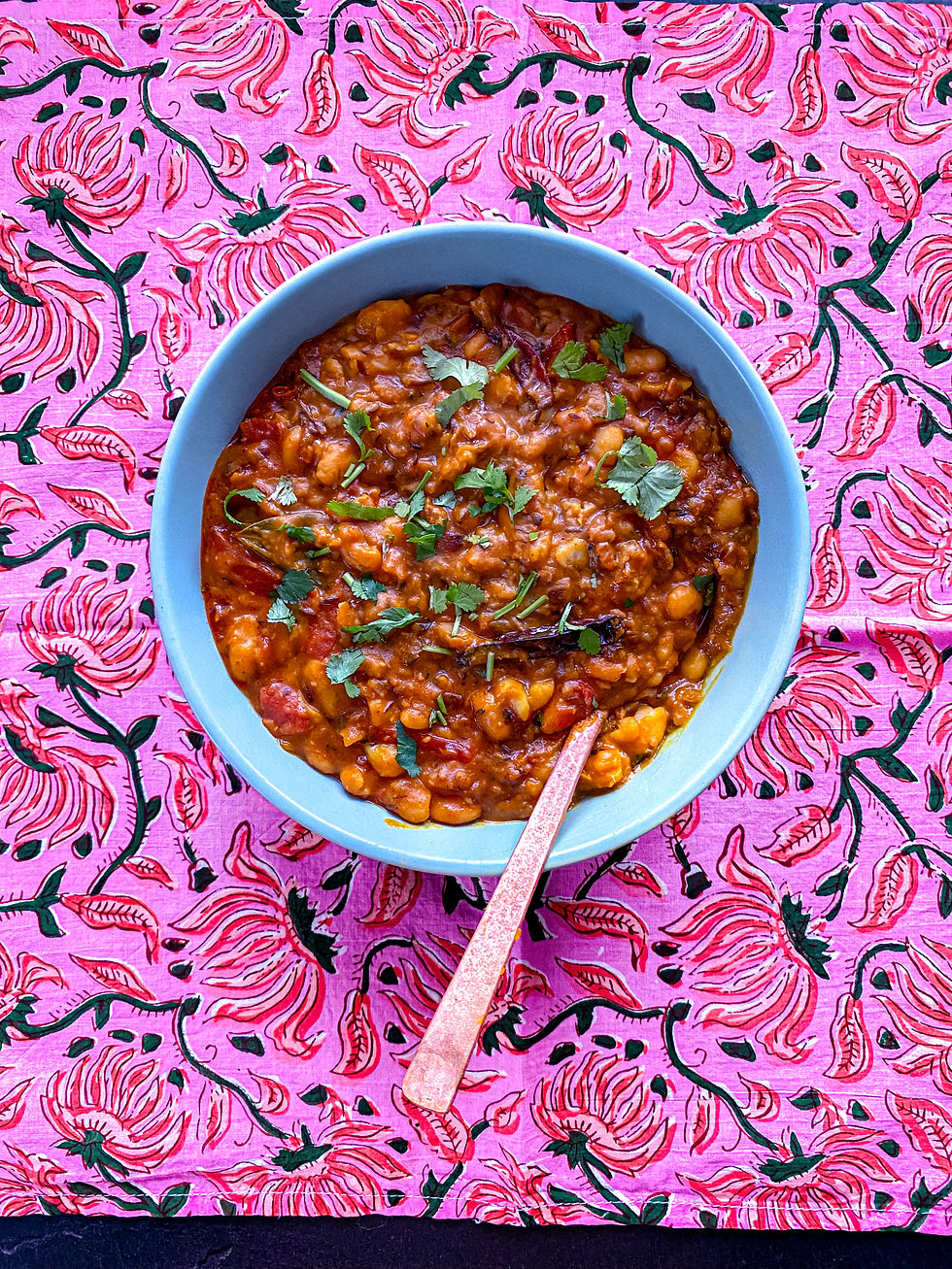 In a separate pan, prepare the tarka by heating oil and butter. Add cumin seeds, asafoetida, and dried red chillies. Finish with Kashmiri red chilli powder and immediately pour over the beans.
